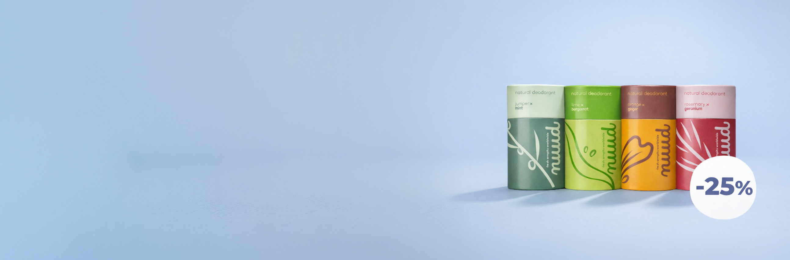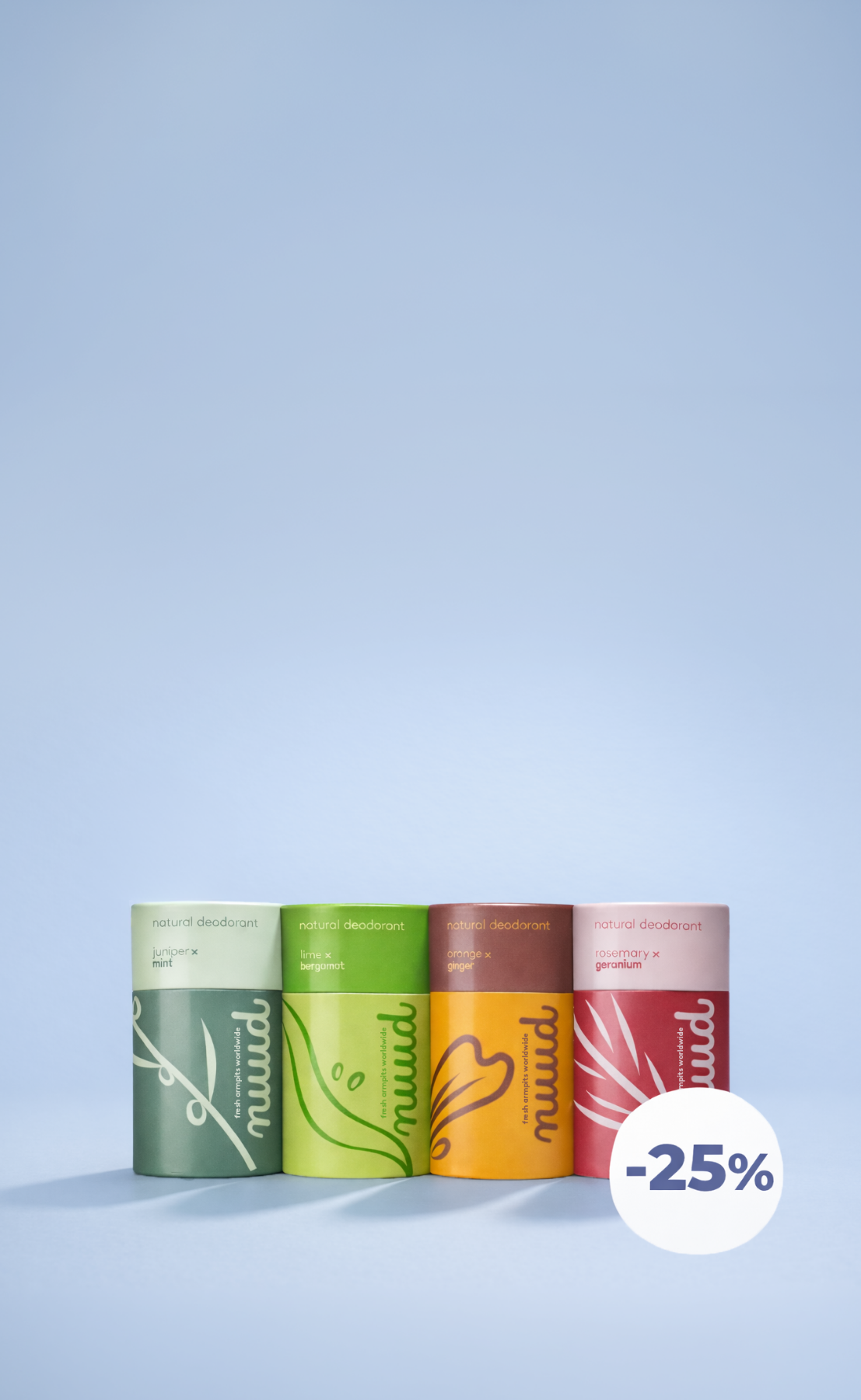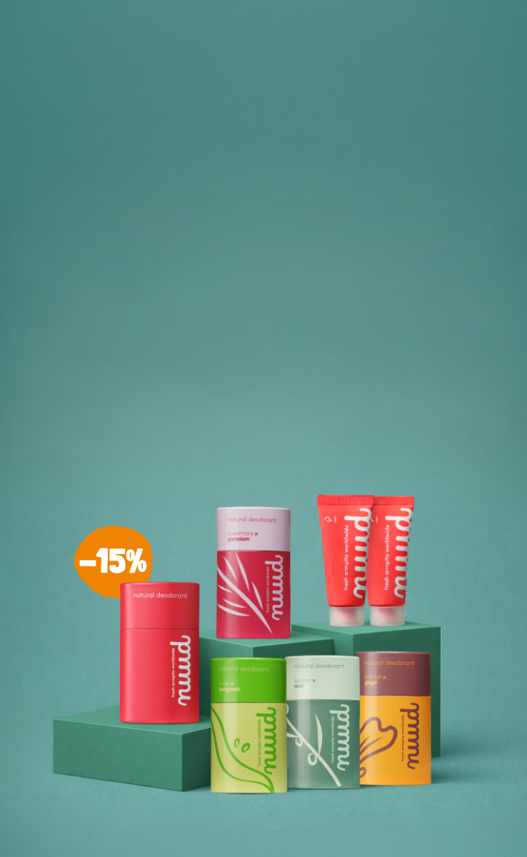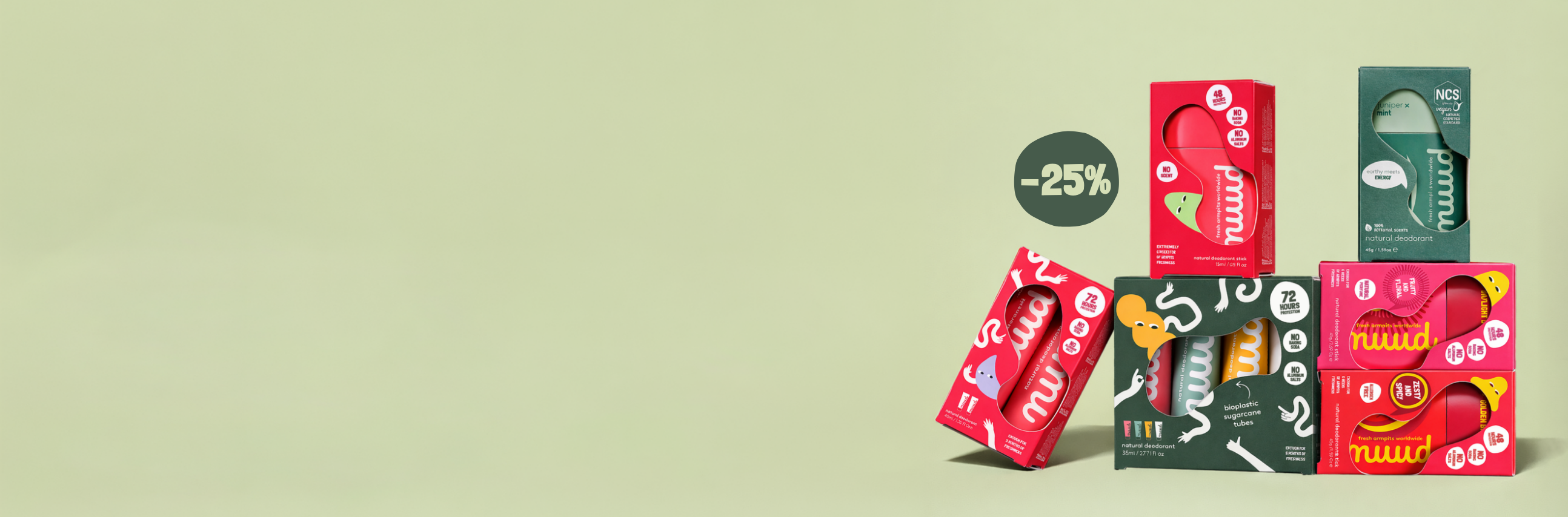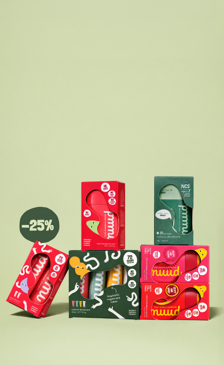 nuud è un antiodorante al 100% naturale e vegano che resta efficace per diversi giorni di seguito. La nostra formula super efficace agisce sul microbioma naturale del corpo.