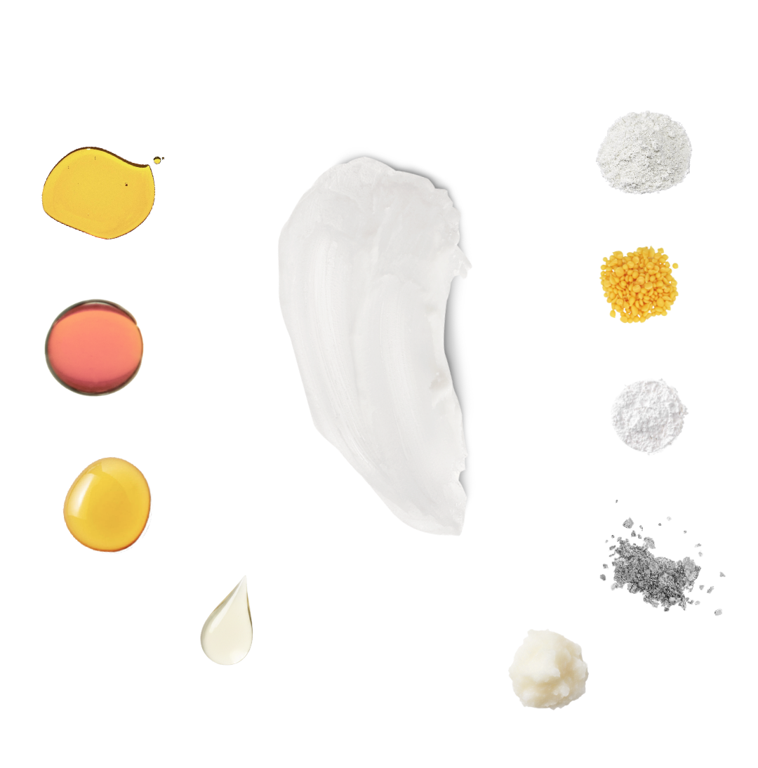 Olio di semi di girasole****, olio di semi di ricino*, ossido di zinco***, olio di semi di fragola*, olio di colza idrogenato**, olio di palma idrogenato**, polvere di radice di arrowroot*, cera di candelilla*, tocoferolo (vitamina E)*, argento***.